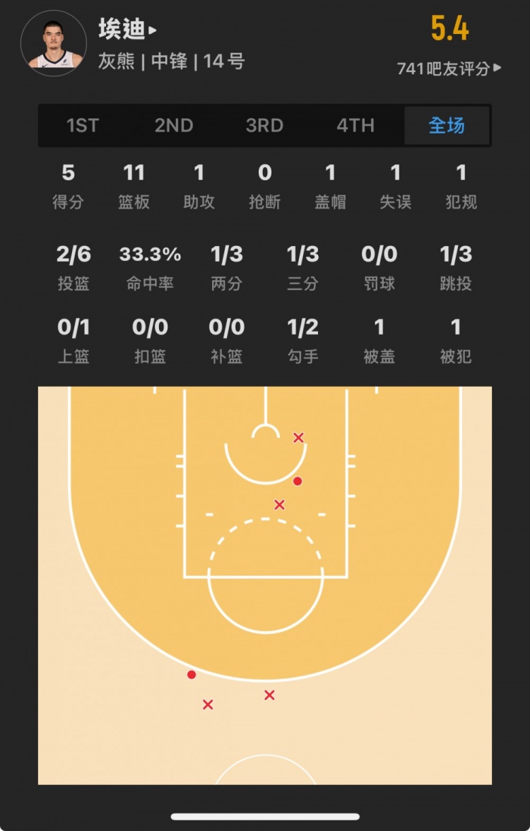 灰熊9號秀 扎克-埃迪 登場(chǎng)21.9分鐘