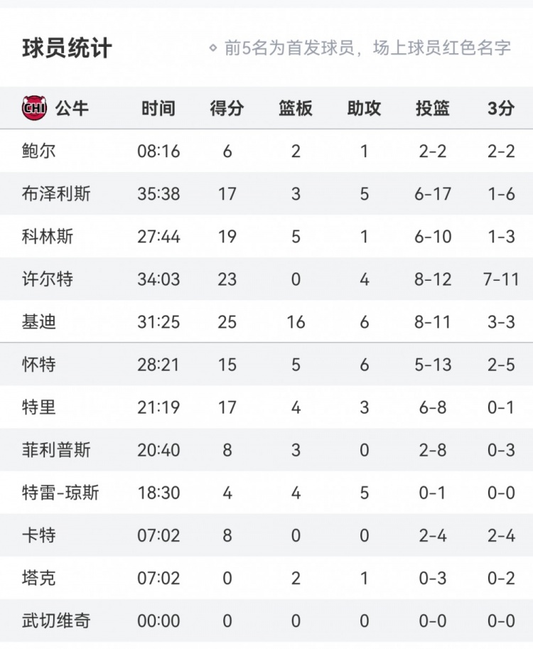 本場(chǎng)比賽,公牛全隊多點(diǎn)開(kāi)花,共有6人得分15+。具體如下: