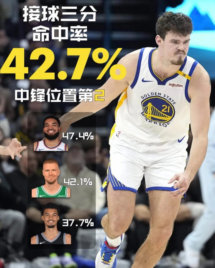 賽季至今,波斯特每場(chǎng)要完成3.7次三分線(xiàn)外的接球投籃,而他命中率高達42.7%。這個(gè)效率在全聯(lián)盟出手至少在3.5次的大個(gè)子里,僅次于唐斯。