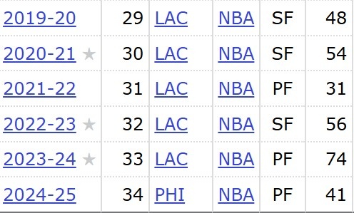 據統計,本賽季喬治出戰41場(chǎng),是他自2021-22賽季以來(lái)出戰最少的一個(gè)賽季,近6年,他已經(jīng)5次出戰不足60場(chǎng),具體如下: