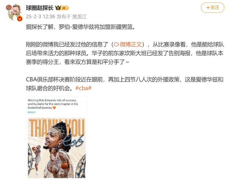 據趙探長(cháng)了解,羅伯-愛(ài)德華茲將加盟新疆男籃。