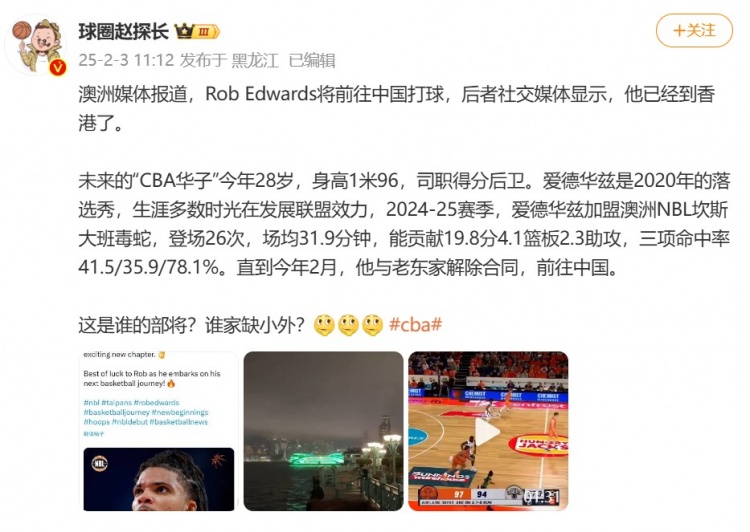 2月3日訊 今日,據媒體人球圈趙探長(cháng)透露,澳洲媒體報道,羅伯-愛(ài)德華茲(Rob Edwards)將來(lái)中國打球,后者社交媒體顯示,他已經(jīng)到香港了。
