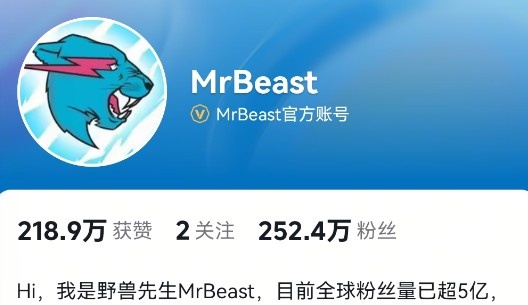 MrBeast原名James Steven “Jimmy” Donaldson,美國Youtube視頻博主。其作為核心成員的MrBeast團隊頻道在Youtube上擁有3.55億粉絲;他在B站有402萬(wàn)粉絲,在抖音有252萬(wàn)粉絲,目前全球粉絲量超5億。