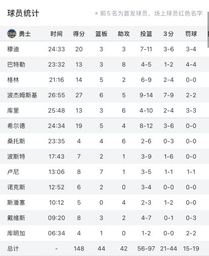 全員發(fā)揮!勇士出戰13人全部都有得分入賬 庫追巴只出戰3節