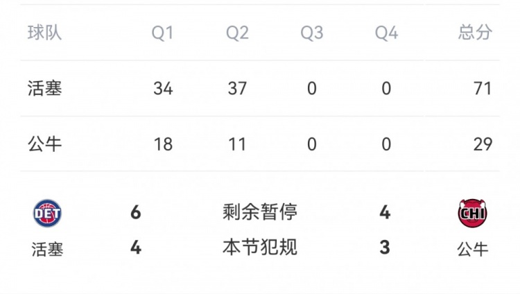 2月12日訊 NBA常規賽,活塞半場(chǎng)71-29領(lǐng)先公牛。
