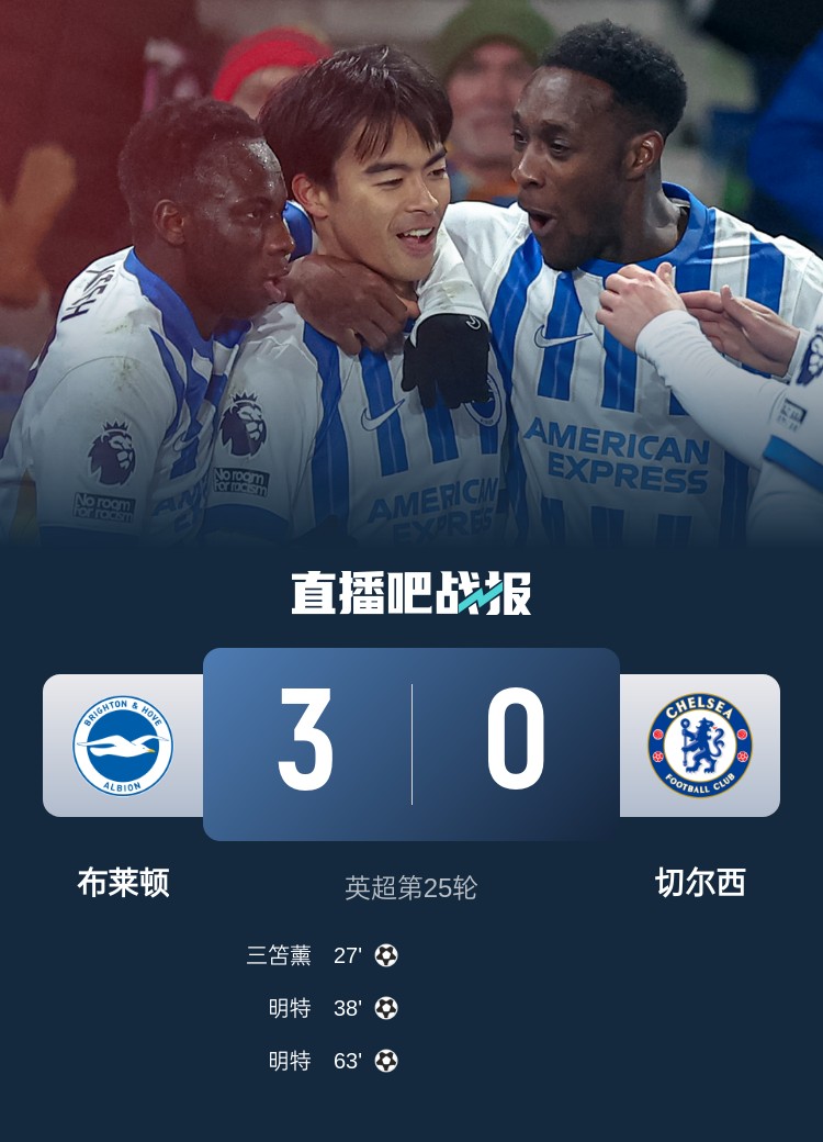 英超第25輪,切爾西客場(chǎng)0-3布萊頓。上半場(chǎng),三笘薰完美停球兜射破門(mén),明特再下一城;下半場(chǎng),明特再入一球完成雙響。