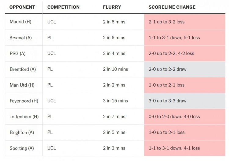 曼城最近9場(chǎng)在10分鐘內連丟兩球的比賽統計
