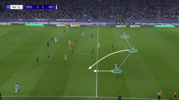 最明顯的例子是對陣葡萄牙體育的比賽。曼城在下半場(chǎng)一開(kāi)始就失誤了,一個(gè)簡(jiǎn)單的二過(guò)一足以讓貢薩爾維斯從他們的中場(chǎng)身后進(jìn)入。他傳球給邊后衛馬克西米利亞諾-阿勞霍,然后皮球越過(guò)了埃德森把守的大門(mén)。阿勞霍破門(mén)后僅86秒,葡萄牙體育就獲得了一個(gè)點(diǎn)球。從開(kāi)球開(kāi)始,曼城就立即轉變?yōu)?-1-3-3陣型來(lái)對陣葡萄牙體育的五后衛。阿坎吉將球傳給了格瓦迪奧爾,后者在理論上來(lái)說(shuō)是有足夠向前推進(jìn)的空間。