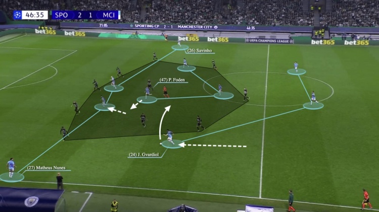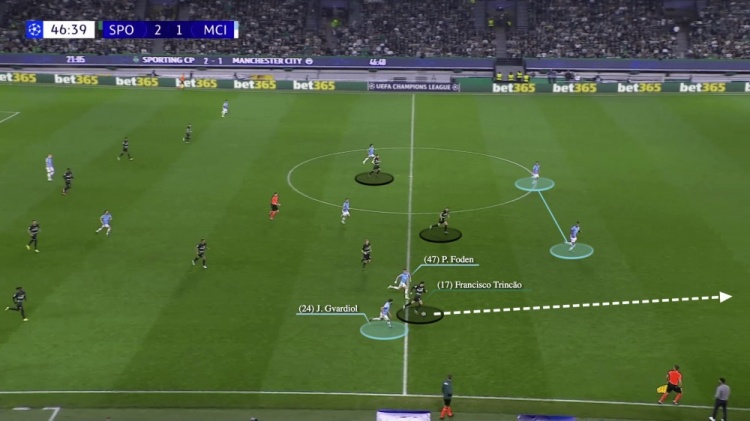 他有三個(gè)合理的選擇:傳給馬修斯-努內斯,或者將球轉移到右路的薩維尼奧,亦或者向后傳遞。但格瓦迪奧爾都沒(méi)有選,而是選擇了最困難的路線(xiàn),傳球給身處重兵集結區域的福登,而且他還沒(méi)有足夠的傳球精度。葡萄牙體育獲得了球權,立即進(jìn)入了格瓦迪奧爾推進(jìn)留下的空間。
