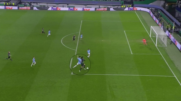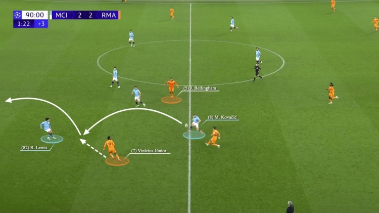 盡管科瓦西奇回過(guò)神來(lái),完成了一次搶斷,但獲得球權之后的他,應該將這個(gè)球直接送到前場(chǎng),或者回傳給埃德森。相反,他將球傳給了劉易斯,且傳球并沒(méi)有成功。維尼修斯率先得到了球,并突破劉易斯,快速向前推進(jìn)。