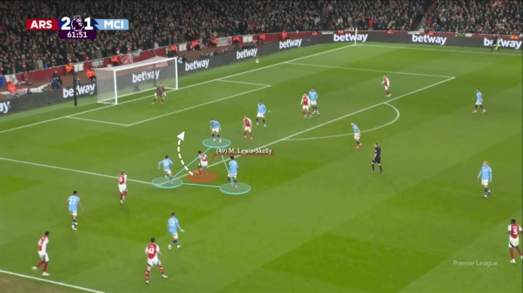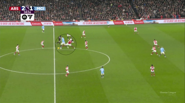 斯凱利接球、轉身和突破,都沒(méi)有受到什么阻礙。他身邊有三名曼城球員,但都沒(méi)有嘗試搶斷。斯通斯在此時(shí)的防守表現得很糟糕,他后撤,試圖擋住對方的射門(mén),但在整個(gè)過(guò)程中都沒(méi)有注意埃德森——或許最初他能配合埃德森,讓阿森納的射門(mén)沒(méi)有那么舒服。