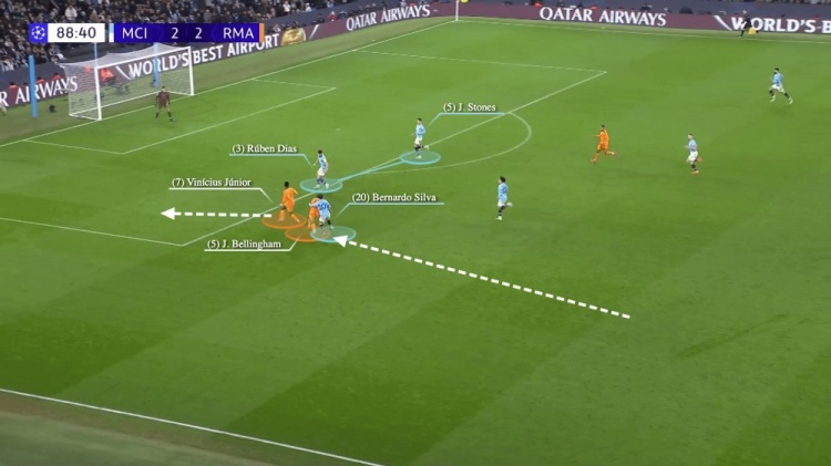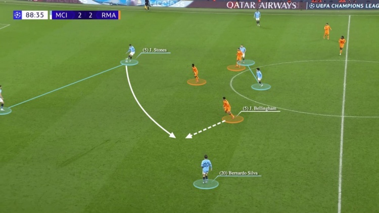 甚至在對陣皇馬的比賽中,此前一直很可靠的斯通斯,也出現了失誤。他在比賽中扮演6號角色,在開(kāi)局后移動(dòng)到了左中后衛的位置上。他傳球給貝爾納多-席爾瓦,就不是一個(gè)合適的選擇。貝林厄姆攔截了這次傳球,并帶球向前推進(jìn),貝爾納多-席爾瓦在禁區外將其包夾,但這一次并沒(méi)有判罰。
