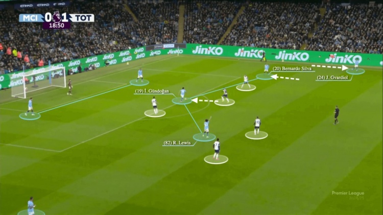 曼城的三名中場(chǎng)球員——里科-劉易斯、貝爾納多-席爾瓦和京多安——都已經(jīng)回收到了禁區附近,京多安將球帶到了禁區邊緣。貝爾納多-席爾瓦和格瓦迪奧爾則在邊路活動(dòng)。