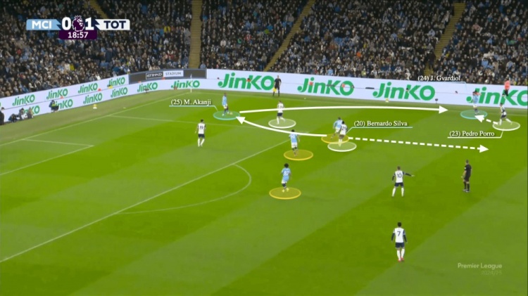 面對熱刺的壓迫,京多安傳球給貝爾納多-席爾瓦,又傳球給阿坎吉。這里的問(wèn)題是,所有三名中場(chǎng)球員(下圖黃點(diǎn))都靠得太近了,并且都是為球而戰——熱刺只需要兩名球員都能夠防住他們。當阿坎吉傳球給格瓦迪奧爾之時(shí),貝爾納多-席爾瓦確實(shí)完成了一次滲透跑動(dòng),但曼城的慢速進(jìn)攻讓熱刺鎖定了他們。