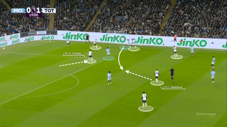 熱刺右后衛波羅逼近,格瓦迪奧爾無(wú)法傳球給阿坎吉或者埃德森。因此他試圖小角度傳球給京多安。熱刺前鋒索蘭克預判了格瓦迪奧爾的動(dòng)作,而格瓦迪奧爾的傳球也出現了失誤——球直接傳給了麥迪遜。
