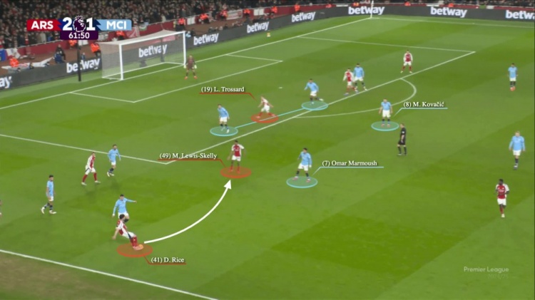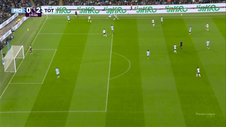10號特林康接球,福登和格瓦迪奧爾都在他的身后。曼城有兩名中后衛,而阿坎吉也在后撤,因為他要設法協(xié)助缺乏對抗經(jīng)驗的年輕球員賈馬伊·辛普森-普西,以應對約克雷斯。特林康一路帶球到曼城禁區,并沒(méi)有受到遭到任何防守威脅。