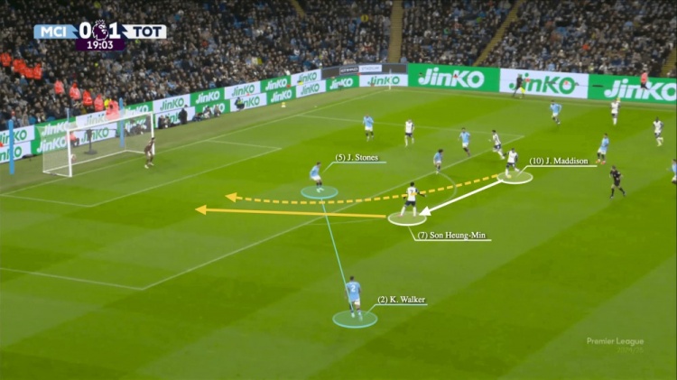 麥迪遜側身傳球找到孫興慜,然后完成突破。孫興慜直面埃德森,完成破門(mén)。