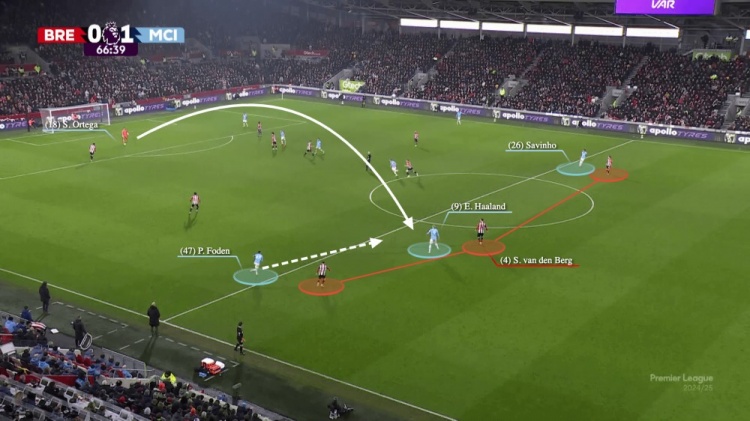 那場(chǎng)比賽的早些時(shí)候,面對布倫特福德的人盯人逼搶?zhuān)m德扛住了對方防守球員,給了福登和薩維尼奧跑動(dòng)的空間。