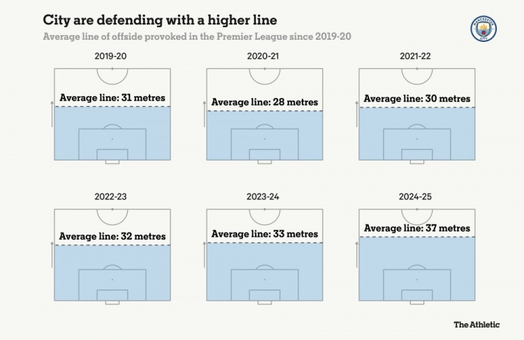 自2019/2020賽季以來(lái),曼城防線(xiàn)高度的變化統計