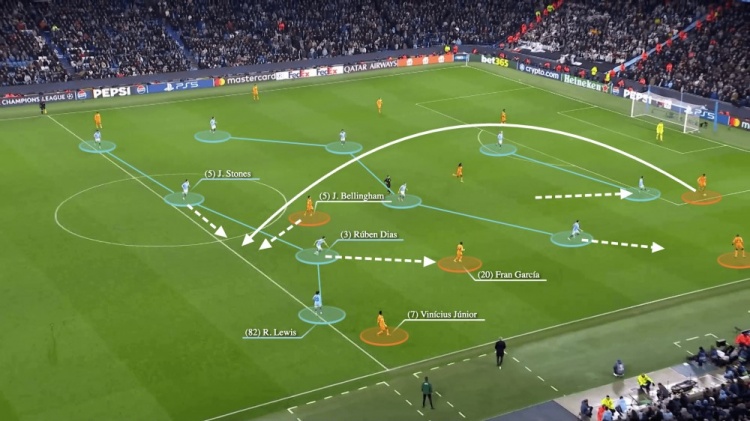 理想情況下,斯通斯和魯本-迪亞斯會(huì )形成默契的配合。雖然魯本-迪亞盯著(zhù)弗蘭-加西亞,并試圖后撤,但斯通斯出現在一個(gè)更靠后的位置,使得貝林厄姆并沒(méi)有被緊盯,有了一個(gè)向前的機會(huì )。