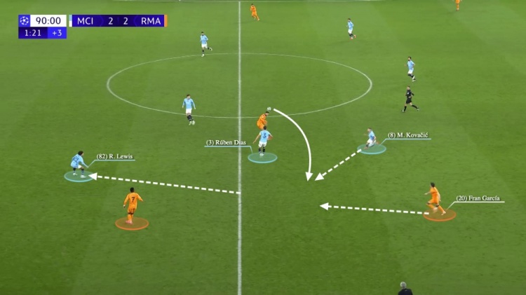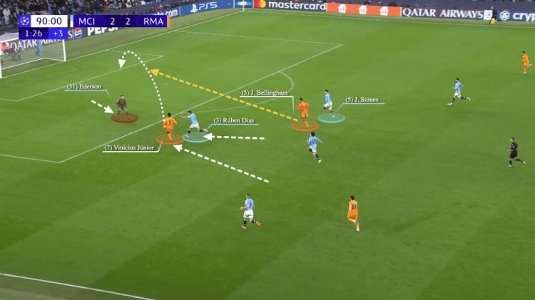 然而曼城的防守調整還是出現了失誤,因為皇馬用弗蘭-加西亞換下了姆巴佩?;蜀R以短傳為主,并在曼城逼搶之時(shí)改用長(cháng)傳推進(jìn)。