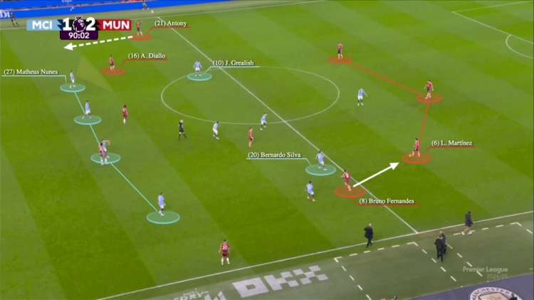 他們在中路的防守很緊湊,但曼聯(lián)并沒(méi)有施加什么壓力。替補出場(chǎng)的貝爾納多-席爾瓦不確定是否是向利桑德羅-馬丁內斯施壓,還是等待布魯諾-費爾南德斯的跑動(dòng)——后者在邊路游弋。下面這個(gè)瞬間,我們能明顯看到哈蘭德希望貝爾納多-席爾瓦能夠施壓。