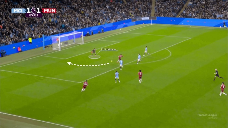 為了應對曼聯(lián)的進(jìn)攻,埃德森保持了一個(gè)較高的站位,但沒(méi)有進(jìn)一步向前采取動(dòng)作。當球進(jìn)入曼城禁區之后,阿瑪德反應迅速,帶球突破埃德森,小角度完成破門(mén)。
