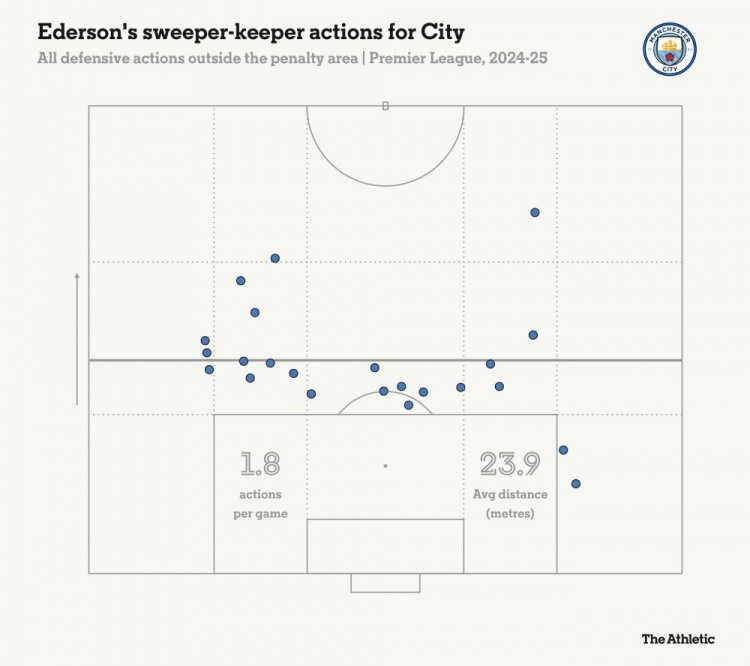 曼城的防守缺陷,使得他們對埃德森的清道夫門(mén)將屬性要求更高了。他的場(chǎng)均1.8次撲救和23.9次的場(chǎng)均禁區外動(dòng)作,是他自2021/2022賽季意義來(lái)最高的,當時(shí)分別為1.5次和25.3次。