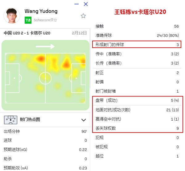 從對戰卡塔爾U20比賽中的數據可以看到,王鈺棟5次過(guò)人4次成功,22次一對一對抗贏(yíng)下14次,送出3次帶來(lái)射門(mén)的關(guān)鍵傳球。