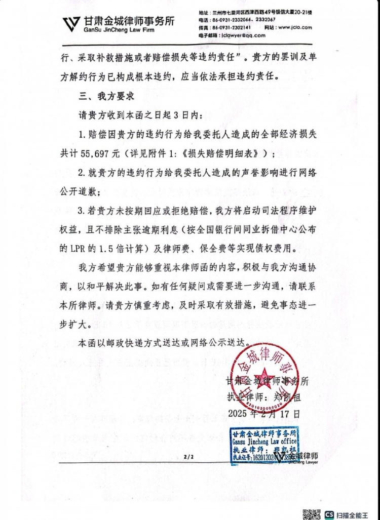 與此同時(shí),蘭州隴原競技要求孟祥昱教練組方面就違約行為賠償55697元,同時(shí)進(jìn)行網(wǎng)絡(luò )公開(kāi)道歉。