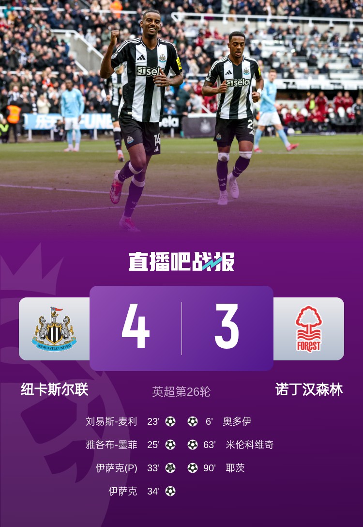 英超第26輪,紐卡4-3諾丁漢森林。上半場(chǎng),奧多伊前場(chǎng)斷球后轟出世界波破門(mén),麥利和墨菲3分鐘內連進(jìn)兩球,埃納手球送點(diǎn),伊薩克點(diǎn)射得手,隨后他梅開(kāi)二度;下半場(chǎng),沙爾頭球中柱,米倫科維奇蝎子擺尾扳回一球,耶茨補時(shí)階段再追一球。