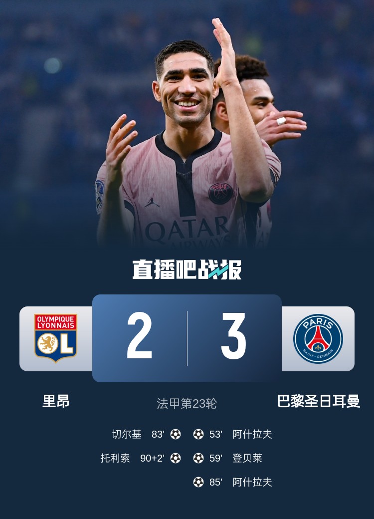 法甲第23輪,巴黎圣日耳曼3-2里昂。上半場(chǎng),阿什拉夫犯規染黃,雙方互交白卷;下半場(chǎng),阿什拉夫打入兩球上演梅開(kāi)二度,登貝萊破門(mén)打入個(gè)人聯(lián)賽第17球,切爾基和托利索為里昂扳回兩球。