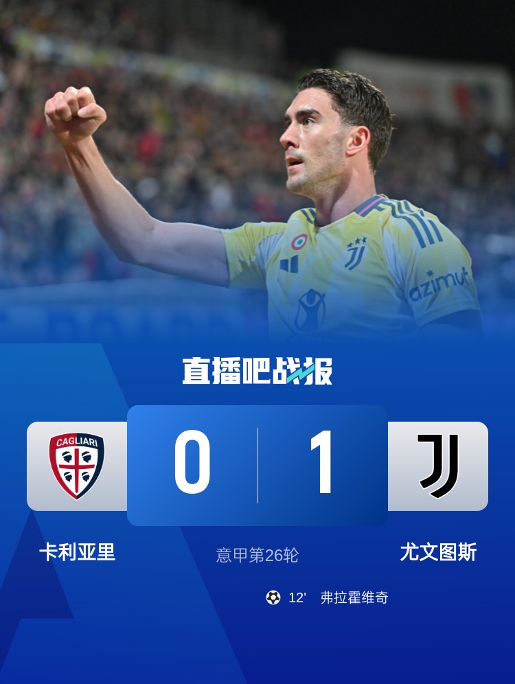 意甲第26輪,尤文1-0卡利亞里,聯(lián)賽4連勝。上半場(chǎng),弗拉霍維奇過(guò)掉門(mén)將小角度破門(mén);下半場(chǎng),坎比亞索傷退,替補出場(chǎng)僅20分鐘的道格拉斯-路易斯也傷退。