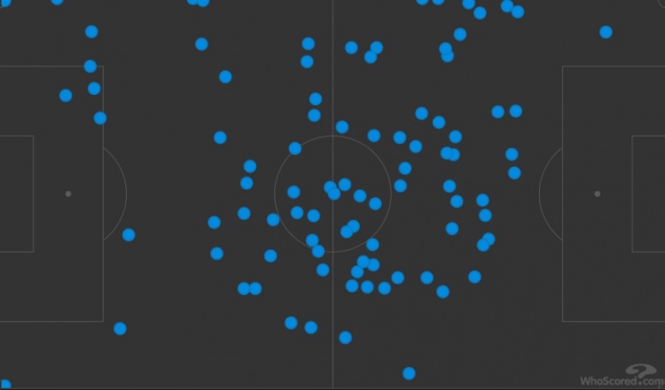 中場(chǎng)的傳球散點(diǎn)圖:幾乎沒(méi)有幾次好的向前機會(huì )