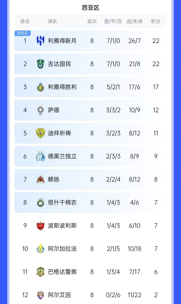 其中利雅得新月首回合0-1落敗但是次回合干脆利落4-0解決戰斗,利雅得勝利首回合0-0打平次回合同樣3-0輕松拿下,吉達國民則是兩回合直接雙殺對手晉級。此外這三隊也是聯(lián)賽階段西亞區的前三名,積分斷層領(lǐng)先。