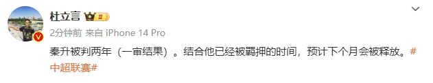 媒體人杜立言消息,秦升被判兩年(一審結果)。結合他已經(jīng)被羈押的時(shí)間,預計下個(gè)月會(huì )被釋放。