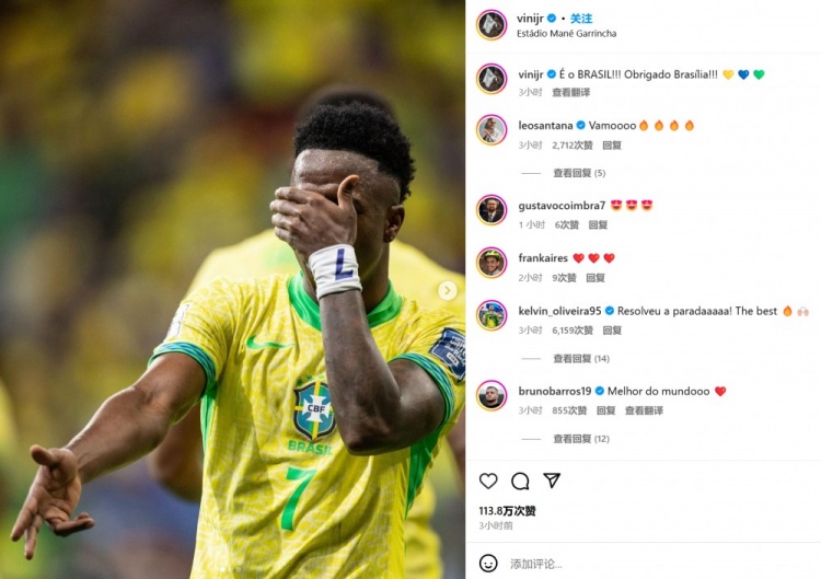 維尼修斯也在賽后通過(guò)社媒曬出自己的慶祝照,并配文:“這就是巴西?。?!感謝巴西利亞?。?!”