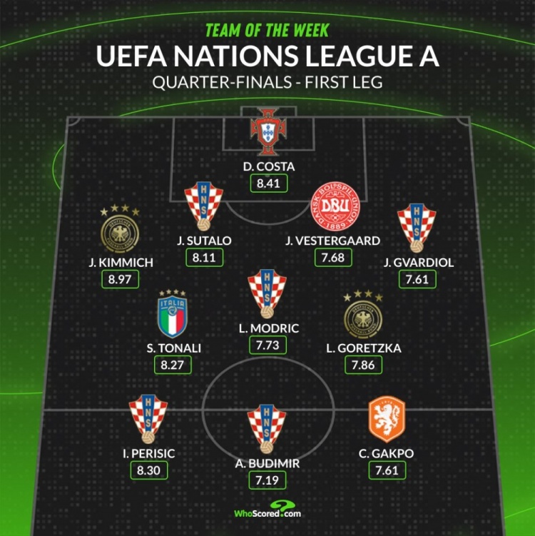 3月21日訊 歐國聯(lián)A級別八強戰首回合已經(jīng)完賽,whoscored也列出了本輪評分最佳陣容,克羅地亞5將在列。