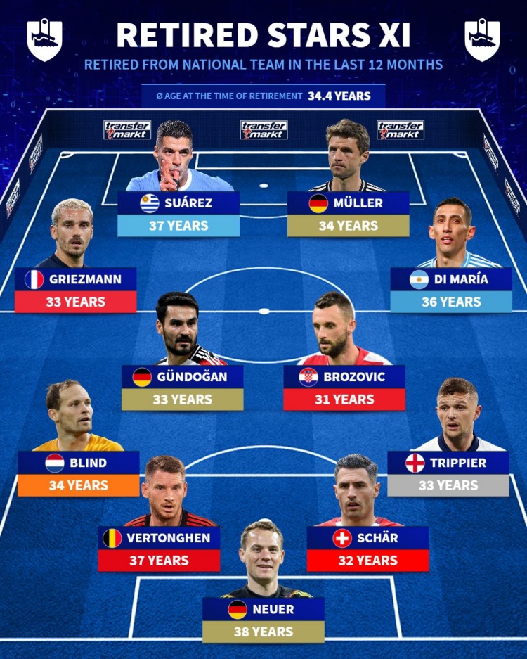 德轉列近一年國家隊退役球星陣容(平均年齡34.4歲)