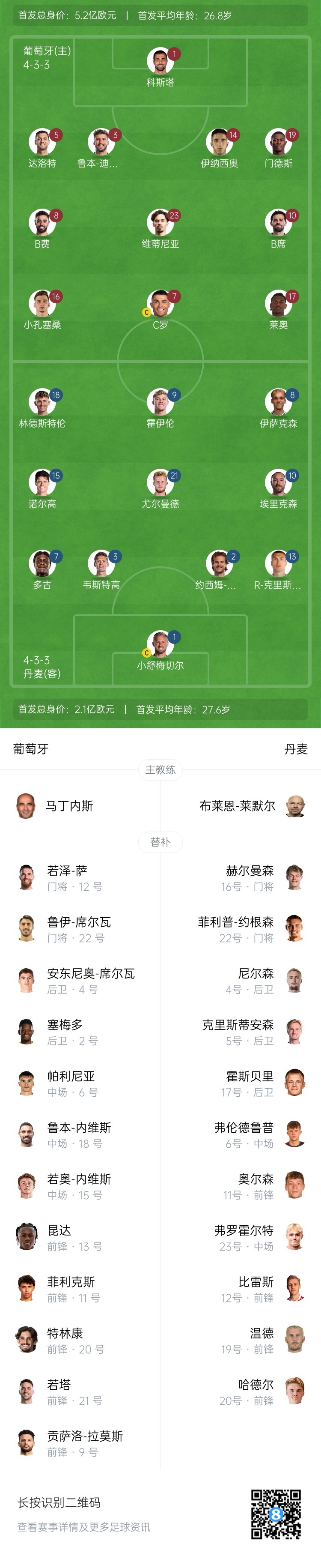 葡萄牙vs丹麥首發(fā):C羅領(lǐng)銜,B費、B席、萊奧先發(fā),霍伊倫出戰