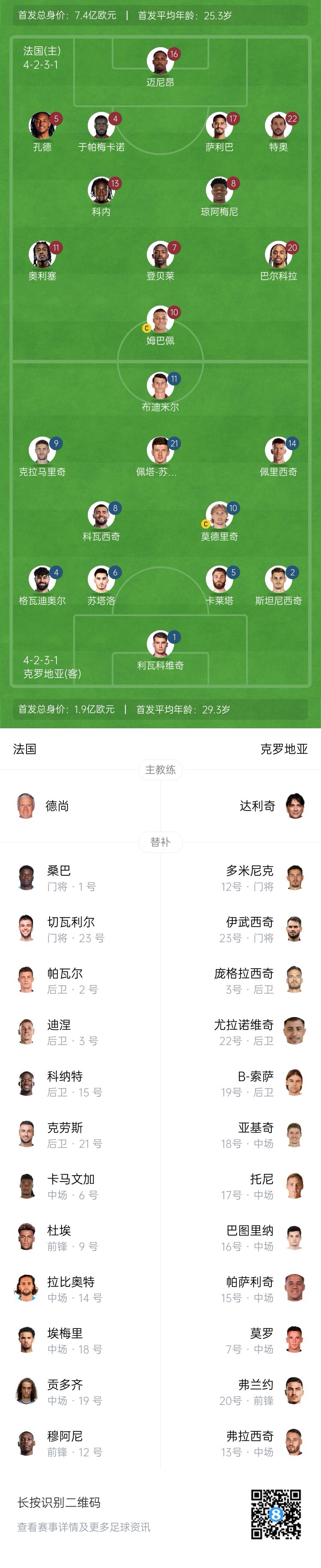 法國首發(fā):16-邁尼昂、5-孔德、4-于帕梅卡諾、17-薩利巴、22-特奧、13-科內、8-瓊阿梅尼、11-奧利塞、7-登貝萊、20-巴爾科拉、10-姆巴佩