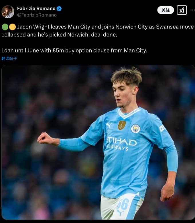 羅馬諾在社媒寫(xiě)道:“盡管加盟斯旺西的談判破裂,不過(guò)雅各布-賴(lài)特依舊將離開(kāi)曼城,球員選擇租借加盟到諾維奇效力。租期到今年6月止,合約中附帶500萬(wàn)鎊選擇買(mǎi)斷條款?!?/p>