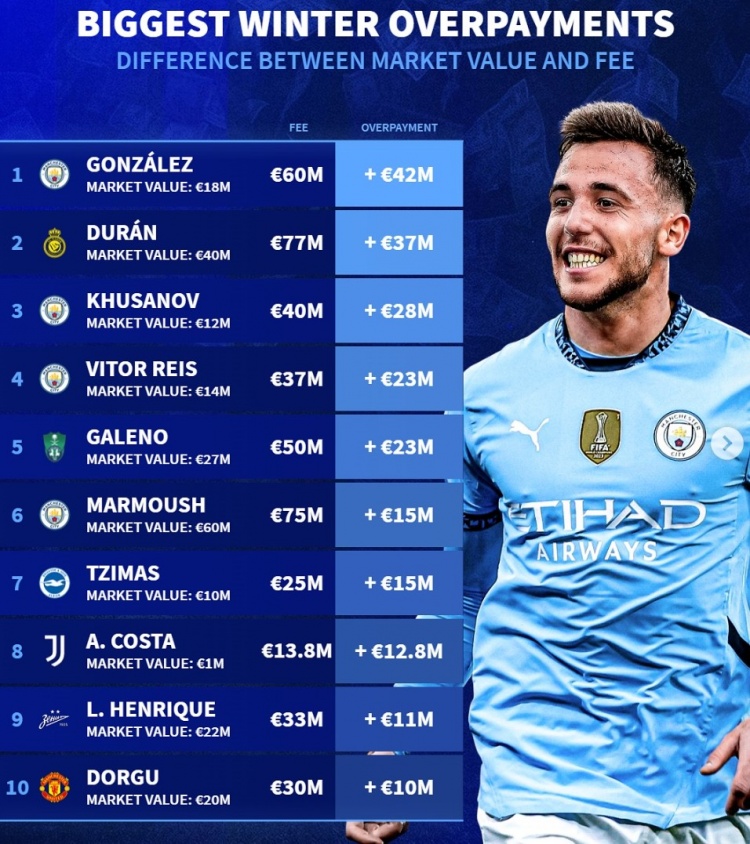 2月5日訊 五大聯(lián)賽冬窗已經(jīng)結束,《轉會(huì )市場(chǎng)》也列出了冬窗溢價(jià)引援榜,前六中曼城占據4席。