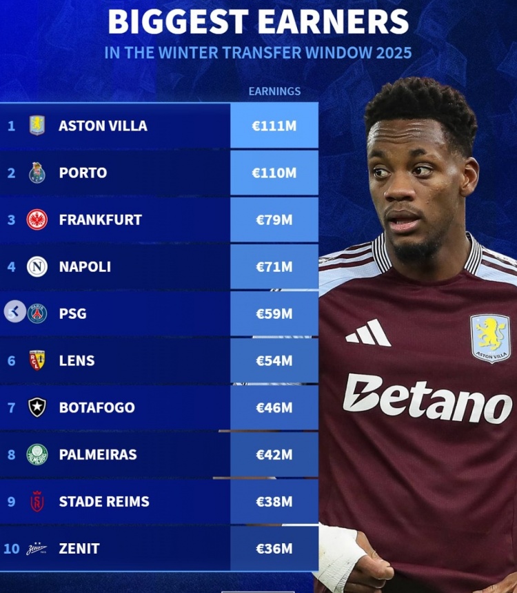 2月5日訊 五大聯(lián)賽已經(jīng)關(guān)窗,《轉會(huì )市場(chǎng)》也統計了今年冬窗各隊收入情況,維拉力壓波爾圖居首。