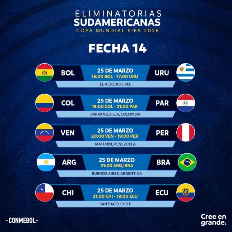 2月1日訊 南美足聯(lián)曬出了第13輪、第14輪世預賽的開(kāi)球時(shí)間,3月22日7點(diǎn)30分烏拉圭vs阿根廷、3月26日8點(diǎn)阿根廷vs巴西。